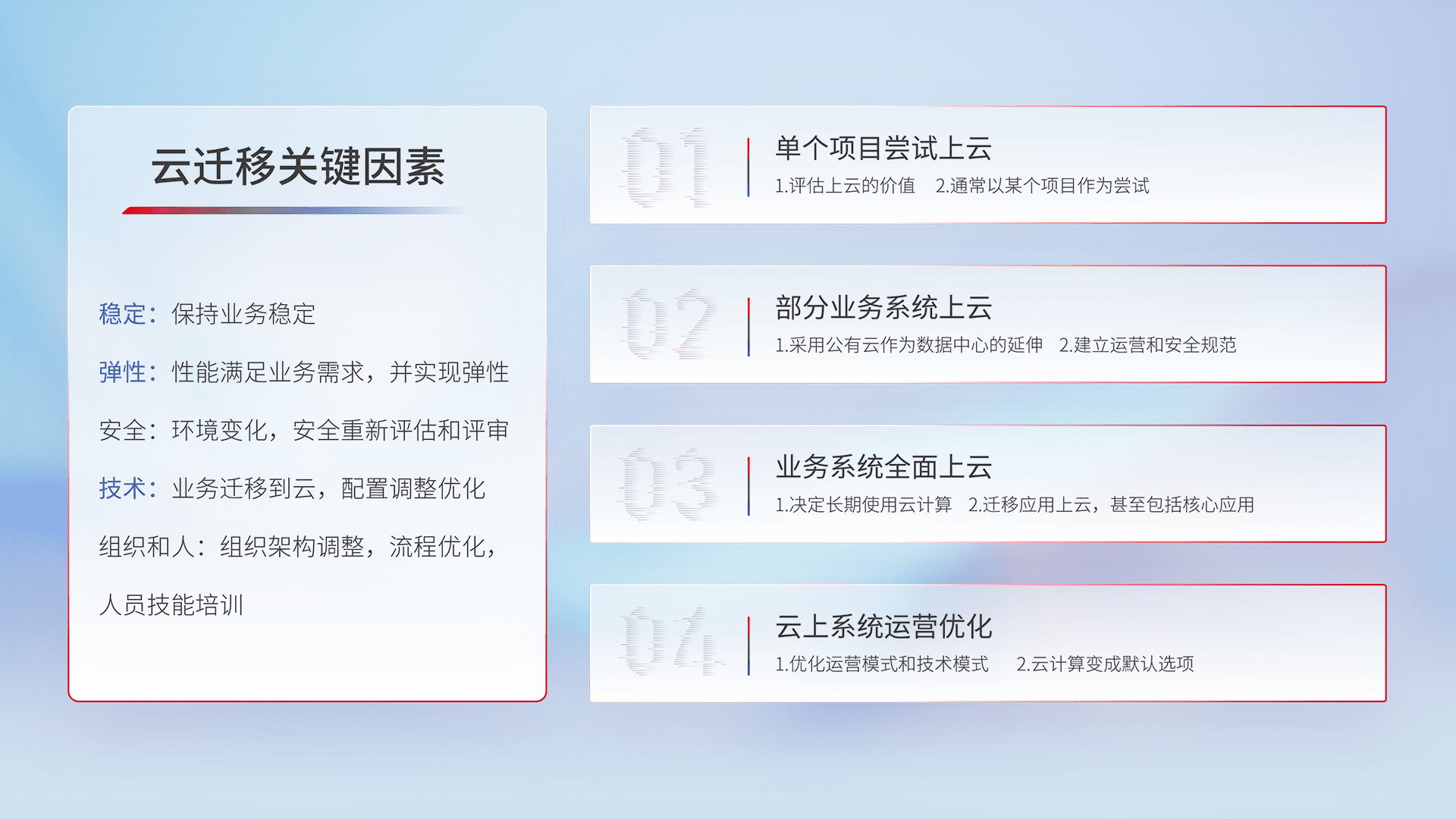 结合实际业务,,,从规划设计、、、云平台选型、、、、云原生改造、、、、数据迁移、、集成交付,,迁移全过程为客户识别最佳上云路径,,,做好风险识别管理,,,设计网络架构、、、身份权限、、、、安全审计合规、、、操作审计、、、日志审计、、、、监控告警策略、、多站点容灾设计等,,,,对云上基础设施进行整体规划,,,提升IT治理水平,,以满足弹性、、、高可用、、、、高性能的需求。。。。