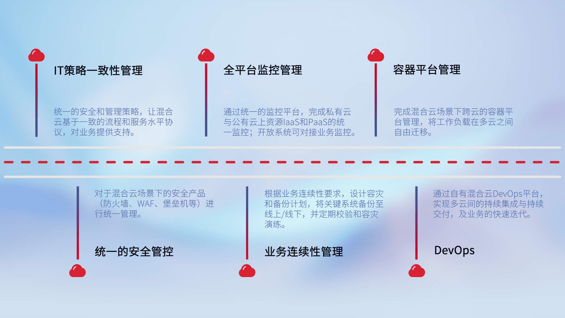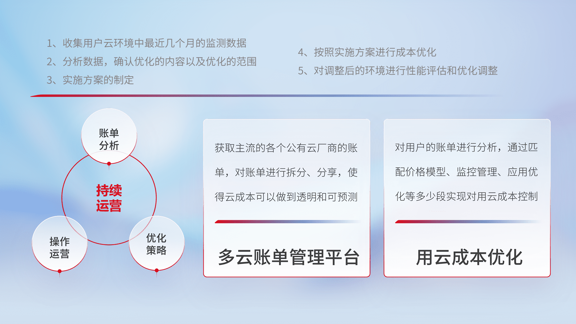 通过多云纳管,,,,以统一的资源数据模型把客户的云资源进行抽象和封装,,,进而实现对多云资源的统一操作,,保障云资源管理的可靠性、、、稳定性与可用性。。。量身定制化运维内容,,,配置、、开发运维、、补丁管理、、、、备份、、监控、、认证和访问管理、、审计和日常巡检等,,,,保障在用云过程中的可靠度,,,稳定度以及高可用率。。。